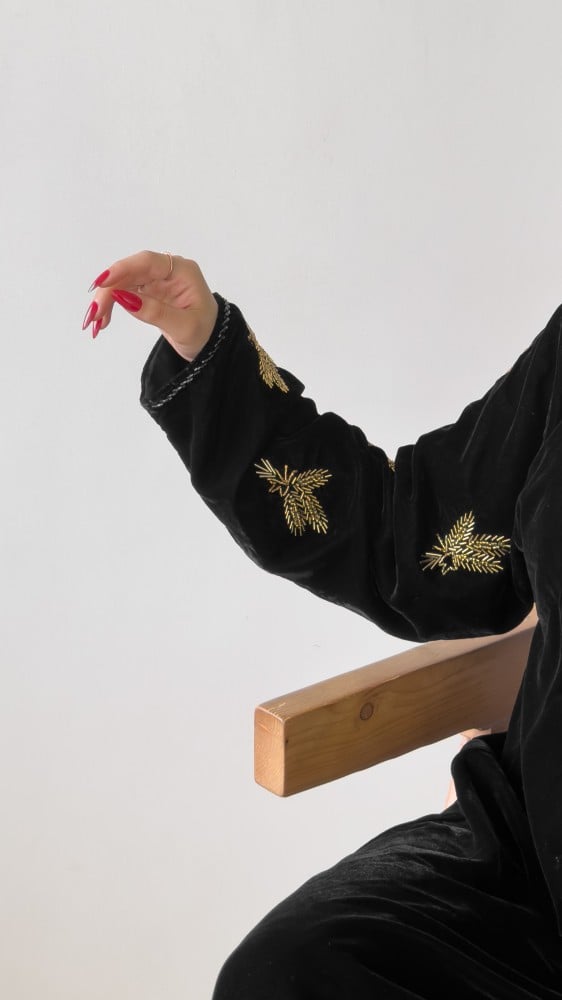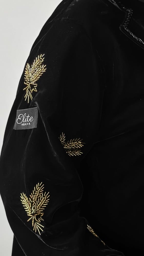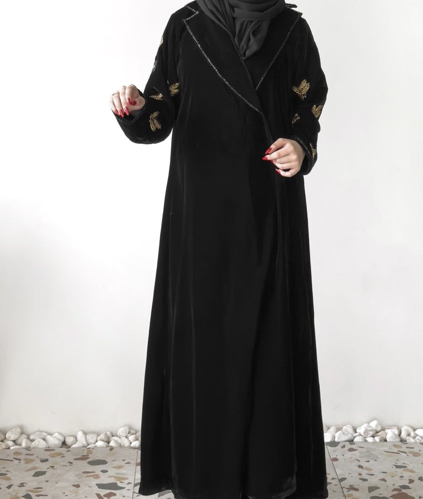 نوع القماش : العباية اسود مخمل والأكمام مخمل اسود ، بشك ذهبي